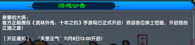 武林外传十年之约 【开区通知】:“天罡正气”11月8日13:00开启!