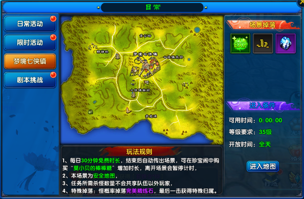《武林外传十年之约》当玩家等级达到35级即可进入场景,每日每名玩家均拥有30分钟的免费时长,免费时长结束后会自动退出场景,如果觉得免费时长不够用,也可在珍宝阁中购买价格为20元宝的“莫小贝的棒棒糖”,每日限购24个,每支增加30分钟,足足拥有12小时的时间,如果中途想退出时间却没用完,也不必担心,离开场景会自动暂停计时。 ![]() 《武林外传十年之约》进入地图后,直接开始计时,建议立即前往进行每日任务,不浪费任何一点免费时间,消灭一定数量的怪即可完成任务。 ![]() (37级以上玩家自动前往击杀小土豆)