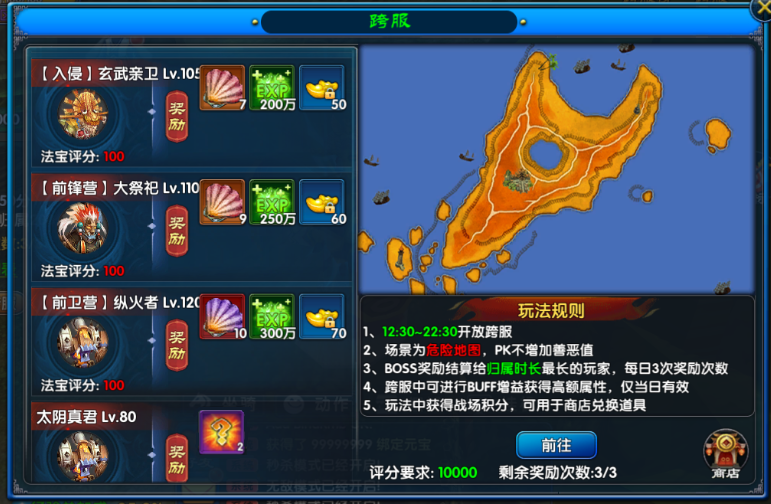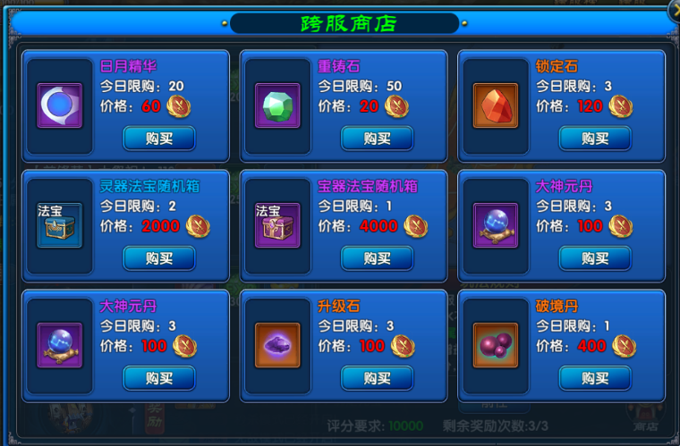 跨服商店与法宝你在跨服激战中积累的每一分荣誉,都可在跨服商店中兑换为实实在在的成长助力。跨服商店中可使用积分兑换多种稀有道具及法宝宝箱。合理规划积分使用,最大化你的跨服收益!