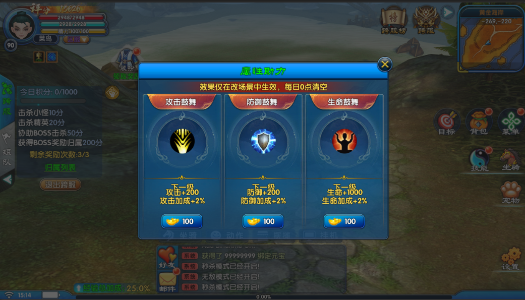 属性助力在跨服场景中,你可购买攻击鼓舞、防御鼓舞、生命鼓舞等BUFF,获得高额属性加成,但效果仅在跨服场景生效,每日0点清空。少侠们可根据战局走向及自身需求,灵活搭配使用,关键时刻或能扭转战局! ![]() 目前,跨服系统已进入最后调试阶段,更多关于玩法机制、首领情报、积分体系的细节,在上线后诚邀各位少侠前来挑战,共同打磨这一全新的武林试炼! |